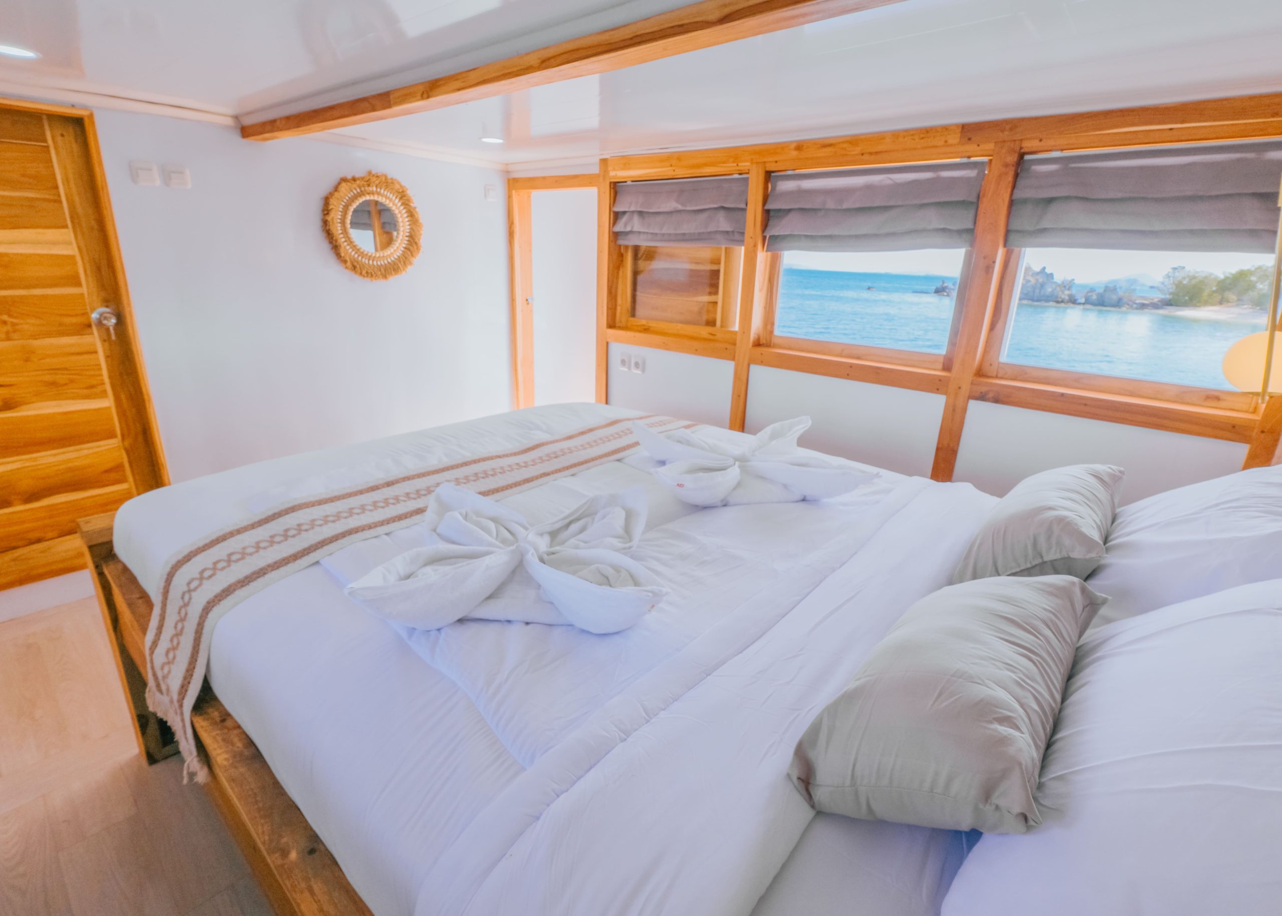 | Master Cabin | IDR 6,950,000 / Person BATHUB & BALCONY KING SIZE BED EXTRA BED IDR 3,500,000 / PAX MIN. 2 PAX |